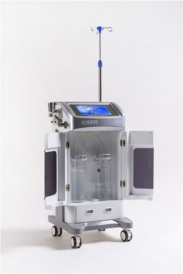 多功能清創(chuàng)機具有快速脈動壓力清創(chuàng)和超聲波清創(chuàng)及廢液回收三位一體之功能??焖倜}動壓力清創(chuàng)將產生出脈沖壓力水,使創(chuàng)傷組織表面在收縮和舒張之間有規(guī)律的反復交替出現(xiàn),沖洗液中的水流氣泡破裂產生的推力,將使夾雜在創(chuàng)面的污染物松動地被水流帶走。通過沖洗液的多種物理聯(lián)合作用可達到清除創(chuàng)面的異物,這種清創(chuàng)主要用于大面積開放性創(chuàng)傷。使用中沖洗槍的脈動壓力水流在醫(yī)務人員的操作下可以從任意角度針對性地沖洗創(chuàng)面,大大提高清創(chuàng)的速度和潔凈度。